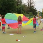 Auf dem Sportplatz waren für die Kinder Spielstationen aufgebaut. Begeistert wurde mit den französischen Partnerkindern Dinos geangelt, Dosenlauf gemacht, Fallschirm geschwungen und vieles mehr. Leider setzte ein Regenguss dem Spielen ein Ende und alle flüchteten zurück in die Schule. Nach einem Mittagessen mit den berühmten »pinken Würstchen« wurde noch gemeinsam getanzt und danach konnten die Kinder mit ihrem Partner ein Domino mit deutschen und französischen Wörtern basteln und spielen. Alle hatten viel Freude an den gemeinsamen Aktionen und erst am Nachmittag traten alle glücklich und auch erschöpft wieder die Heimfahrt nach Nord-rach an.