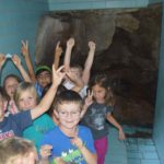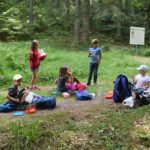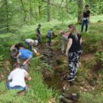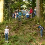 Die Kinder durften sich dann auf die Spuren der damaligen Menschen machen. Sie fanden zunächst die Viehtränke, die trotz der schon langanhaltenden Trockenperiode noch mit reichlich Wasser gefüllt war. Dann erspähten die Kinder die Reste des Schäfersfeldhofs und erklommen die noch gut erhaltene Einfahrtsrampe zur Tenne des früheren Hofgebäudes.