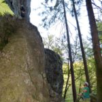 Timo ist inzwischen am Fuß der Felswand angelangt und klinkt sich aus dem für das Abseilen verwendeten Strang aus. Nikolaus Bruder folgt ihm mit Karacho, die Erfahrung macht’s. »Das Abseilen macht am meisten Spaß«, verkünden die beiden unisono, mit glücklich entspannten Gesichtern. Als befänden sie sich auf ebenem Boden, stehen sie auf einem dem gänzlich ungeübten Beobachter doch arg schmal wirkenden Grat, kehren dem brüsk abfallenden Waldhang in aller Selbstverständlichkeit den Rücken zu.