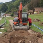 Seit wenigen Tagen erfolgt nun der Anschluss des Gebiets Michelbach zwischen Dorf und Allmend an das Fernwärmenetz. In den Graben der rund ein Kilometer langen Fernwärmeleitung einschließlich der Hausanschlüsse verlegt das E-Werk zusätzlich ein Erdkabel. Die Freileitungen zu den Häusern können danach abgebaut werden. Auch die Gemeinde Nordrach nutzt die Gelegenheit, in diesem Graben eine neue Wasserleitung für die Häuser im Michelbach zu verlegen.