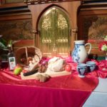 Feierlich zog die Trachtengruppe zu den Klängen der Trachtenkapelle am Sonntagmorgen in die schön herbstlich geschmückte Kirche ein. Die Männer der Trachtengruppe brachten eine reich geschmückte Helmenwanne zur Kirche. Vor dem Altar der Pfarrkirche war ein üppig geschmückter mit allerlei Herbstfrüchten, Honig, Speck, Brot und Butter reich geschmückter Erntealtar aufgebaut. Am Seitenaltar, dem Familienaltar, war ein schönes Bauernvesper dargestellt.