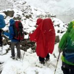 So war der Rucksack auch leichter, um am nächsten Tag eine Tour in das Tal Mala Studena zu unternehmen. DieTeryho-Hütte (2.015 Meter ü. NN) war schon von weitem zu sehen. Bei sonnigem Wetter beschloss die Gruppe zum schwierigsten Übergang in der Hohen Tatra, dem Prinzensattel (2.352 Meter ü. NN), aufzusteigen. Über einen Klettersteig erreichte man eine schmale doppelte Scharte zwischen den Gipfeln Siroska veza und Priecna veza. Weiter abwärts mit kurzer Einkehr auf der Hütte Zbojnicka chata (1.960 Meter ü. NN) kehrten alle von dieser schönen Tour zurück. Das Hüttenteam sorgte für das leibliche Wohl der Wanderer. Nach dem Frühstück und bei kühlem regnerischem Wetter ging es auf dem Höhenweg Tatranská Magistrala weiter. Vorbei an Hrebienok (1.285 Meter ü. NN), Bergstation der Bodenseilbahn, mit Blick in den Poprader Talkessel wurden die nächsten Wanderkilometer zurückgelegt. Der Regen verwandelte sich bald in Schnee. Latschenkiefern säumten den schmalen Weg. Rechtzeitig zu Mittag erreichte man das Berghotel Sliezsky Dom (1.670 Meter ü. NN). Eine heiße Suppe belebte die Lebensgeister der durchnässten Wanderer. Der Nebel, der auch seinen besonderen Reiz hatte, begleitete die Gruppe zum See Batizovske pleso (1.879 Meter ü. NN), am Fuße des höchsten Tatragipfels Gerlachovsky stit (2.655 Meter ü. NN) gelegen. Nach kurzer Orientierung auf dem schneeverwehten Sattel Sedlo pod Ostrva (1.959 Meter ü. NN), ging es in 30 Serpentinen steil abwärts zum Berghotel Popradske pleso (1.494 Meter ü. NN). Hier wurde auch für zwei Nächte gebucht. Mit Knoblauchsuppe, Gulasch und einem Glas Kofola klang der Abend aus. Am nächsten Morgen wanderte eine Gruppe an den See Strbske Pleso (1.355 Meter ü. NN). Die andere Gruppe machte sich auf den Weg zur höchstgelegenen Hütte in der Hohen Tatra, Chata pod Rysmi (2.250 Meter ü. NN). Durch das Tal Mengusovska führte der Steig über viele Serpentinen in den Talkessel der Seen Zabie plesa, und weiter über eine mit Ketten gesicherte Felsstufe zur Hütte. Da es die Wetterbedingungen nicht zuließen auf den Rysy (2.503 Meter ü. NN) aufzusteigen, wurde eine ausgiebige Rast in dieser Hütte gemacht. Mit Gedanken an ein warmes Abendessen stiegen die Bergwanderer wieder zum Berghotel ab.