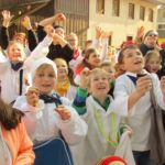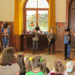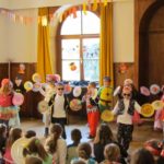 Anschließend zogen alle zur Grundschule, wo die Kinder aus den Klassenzimmern befreit wurden. In der Turnhalle präsentierten die einzelnen Klassen Tänze und Spiele und sangen auch das Glashansele-Lied. Das Lehrerkollegium hatte sich gemäß dem Fasendmotto mit alten Berufskleidern präsentiert. Die Narrenräte mussten die alten Berufe pantomimisch darstellen und erraten, was ihnen vortrefflich gelang.