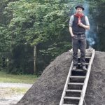Seit letzter Woche wurde der Meiler aufgebaut. Ein Fundament aus Fichtenstangen und Schwartenbrettern sowie ein Kamin aus Fichtenstangen bilden den Unterbau für 17 Ster Buchenholz, das fachkundig aufgesetzt wurde. Frisch geschnittenes Gras ist die Isolierschicht zur schwarzen Lösche, die als Abschluss in mühevoller Handarbeit auf dem Meiler aufgebracht wird.