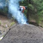 Carsten Erhardt reichte dem Köhler eine Schaufel Glut, Thomas Faißt stieg auf den Meiler und entzündet dort oben damit zunächst ein kleines Feuer, das seine Glut langsam in den geöffneten und mit Holz und Kohle gefüllten Kamin des Meilers einrieseln ließ. Hierdurch wurde der Kohlemeiler langsam entzündet und die Verkohlung initiiert. Die Aufgabe des Köhlers in den nächsten Tagen ist es, alle eineinhalb Stunden die Entzündung des Holzes und die Verbreitung der Hitze zu kontrollieren und zu steuern. Eine schlafraubende Arbeit, die die ganze Aufmerksamkeit des Köhlers und der Köhlerin bedarf.