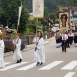 Am Sonntagmorgen waren Kirche, Pfarrhaus und Häuser im Dorf mit Fahnen und „Bischele“ geschmückt. Bereits um 8.30 Uhr riefen die Glocken die Gläubigen zum Festgottesdienst in die Pfarrkirche. Pfarrer Bonaventura Gerner erwähnte in seiner Predigt die Proteste gegen den Braunkohlentageabbau in Garzweiler und für einen besseren Klimaschutz und lobte die heutige Jugend, »die sich nicht mehr mit Worthülsen abspeisen« lasse. Ein kritisches Wort galt auch der eigenen Kirche für ihren Umgang mit dem sexuellen Missbrauch, dem Finanzskandal und anderen drängenden Problemen. Er nahm das Motto der diesjährigen Erstkommunion auf und forderte die Gläubigen auf, »auf Christus zu schauen, er ist die Quelle des Lebens«. Der Chor der Klänge unter der Leitung von Viktor Kraus umrahmte den Gottesdienst musikalisch.