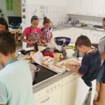 Zur Vorspeise gab es Grießklößchensuppe. Dazu haben die Kinder eine Gemüsebrühe selbst angesetzt. Auch die Grießklößchen wurden selbst hergestellt und mit viel Mühe geformt. Zum Hauptgang gab es zwei verschiedene Knödelgerichte, zum einen selbst gemachte Semmelknödel mit frisch zubereiteter Pilzsoße. Zum anderen selbst gemachte Kaßpressknödel mit Bergkäse, dazu ein leckeres Ratatouille. Die Kinder aus der Nachtischgruppe zauberten Topfenknödel mit Kirschsoße.