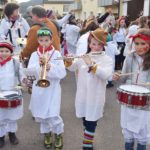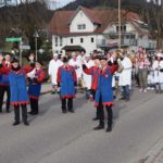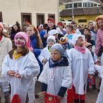 Narrenräte und Hemdglunkerkapelle führten den Umzug an. Start war beim Kindergarten und erster Halt nach wenigen Metern beim Pfarrhaus. Weiter ging es bis zur ehemaligen Bäckerei Geiges und zu Schoko-L, dann wieder zurück zum Rathaus, wo die »Gitzig-Rufe« auch Bürgermeister Carsten Erhardt und die noch vorhandene Rathausbesatzung erbarmten. Sie ließen reichlich Süßigkeiten von oben regnen.