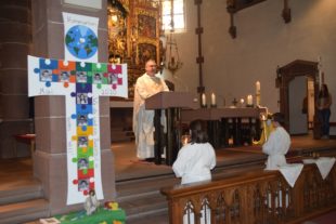 In seiner Predigt wies Pfarrer Gerner auf das diesjährige Motto des Weißen Sonntags hin: »Wir alle sind ein Puzzleteil in Gottes Welt«. Die Fotos der Erstkommunionkinder seien als Puzzle an einer Säule vor dem Altarraum in Kreuzform angebracht worden. Auch die Kirchenbesucher würden ein lebendes Kreuz bilden von Teilen, die zusammengehören. Die letzten Monate seien eine große Herausforderung für die Kirche und ihn selbst gewesen, da keine Gottesdienste gefeiert werden konnten. Er habe sich aber sehr darüber gefreut, dass an Ostern die Kirche geschmückt war und zahlreiche Gläubige zum Gebet gekommen seien. Das Bedürfnis nach Gott sei dadurch zum Ausdruck gekommen. Gott ließe die Seinen auch nicht allein. Jesus habe am Pfingsttag seinen Geist gesandt und der jungen Kirche seine Hand gereicht. Pfarrer Gerner kritisierte die Corona-Demonstranten, die keine Einschränkungen akzeptierten, koste es, was es wolle. Er forderte dazu auf, aufeinander Rücksicht zu nehmen und die Vorschriften dem Sinne nach auch umzusetzen. Das Liebesgebot sei in jeder Epoche, in jeder Situation immer wieder neu auszuformen.