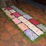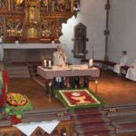 Vor dem Hauptaltar und im hinteren Eingangsbereich der Kirche hatten Mitglieder des Gemeindeteams jeweils kleine Blumenteppiche ausgelegt, diese Tradition blieb wenigstens sichtbar. Die Marien- und Josefstatuen, die die Trachtenträger sonst bei der Prozession tragen, standen mit Blüten verziert auf dem Seitenaltar.