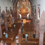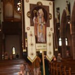 Um 9 Uhr riefen die Glocken die Gläubigen zum Festgottesdienst in die Pfarrkirche. Bruder Berthold wurde beim Einzug in die Kirche nur von den Lektoren Dr. Ansgar Horsthemke und Lucia Lehmann begleitet. Mit ihnen feierten knapp fünfzig Gläubige das Patroziniumsfest, darunter auch Mitglieder der Trachtengruppe in ihrer Festtagstracht. Im Kirchenraum war die Fahne des Hl. Ulrich am Mittelgang aufgestellt worden und wies auf das Patrozinium hin.
