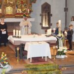 Pastoralreferentin Anke Haas und Simone Zimmerer hatten die Kinder intensiv auf den Kommuniontag vorbereitet. Jedes Kommunionkind hatte während der Gruppenstunden eine Holzblume erhalten. Auf insgesamt sechs Blütenblättern schrieb es in den Gruppenstunden auf, was ihm besonders gefallen hatte. Diese Holzblumen wurden von jedem Kind vorgestellt und wer wollte, durfte etwas zu seiner persönlichen Blume sagen. Dann wurden die Holzblumen am Altar abgelegt.