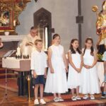 Die Erstkommunionkinder lasen die Fürbitten vor und sangen zur Gitarrenbegleitung von Simone Zimmerer ein Lied. Die Kameradschaft ehemaliger Soldaten war mit einer Fahnen-Abordnung gekommen und Mitglieder der Trachtengruppe nahmen in ihrer Sonntagstracht am Gottesdienst teil. Der „Chor der Klänge“ unter Leitung von Viktor Kraus umrahmte den Gottesdienst musikalisch.