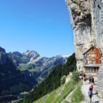Ausgangsort war das letzte Dorf Wasserauen im Alpsteingebirge. Von dort ging es mit der Seilbahn auf die Eben alp (1650 m). Dann musste man zu Fuß ein wenig absteigen, durch eine große Felsenhöhle zum Wildkirchli. Es ist eine Kirche in einer Felsenhöhle die als kirchliche, prähistorische Gedenkstädte und als Wallfahrtsort schon lange bekannt ist. An steiler Felswand noch ein wenig weiter und man ist beim Aescher Berggasthaus. Fast macht es den Anschein, dass dieses Wirtshaus an den senkrechten Fels angeklebt. Es ist auch das älteste Wirtshaus in den Appenzeller Alpen.