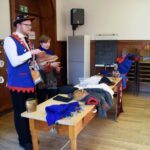 Die Besonderheiten des Häs erläuterte Angela Kiesel. Derbe Holzschuhe, schwarze Hose, weit geschnittener grauer Umhang, an der Vorderseite runde Granulatplättchen und auf der Hinterseite ein rundes Stoffbild, welches einen Glasbläser bei der Arbeit zeigt. Besonders schön ist die Holzmaske mit einem lustigen, verschmitzten Gesichtsausdruck, hergestellt von Holzschnitzer Berthold Eble. In der Hand trägt der Glashansel einen geschälten Wurzelstock eines Ahornbäumchens mit Schellen.