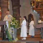 Der „Chor der Klänge“ umrahmte den Gottesdienst musikalisch. Die Erstkommunionkinder sangen das Lied „Lass die Farbe in dein Leben“ und einige von ihnen versahen den Ministrantendienst. Die Kameradschaft ehemaliger Soldaten war mit einer Fahnen-Abordnung gekommen und Mitglieder der Trachtengruppe nahmen in ihrer schönen Sonntagstracht am Gottesdienst teil.