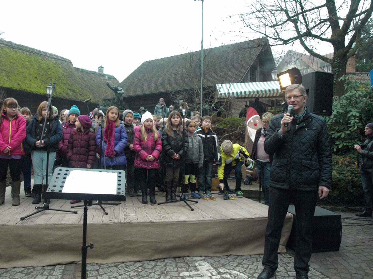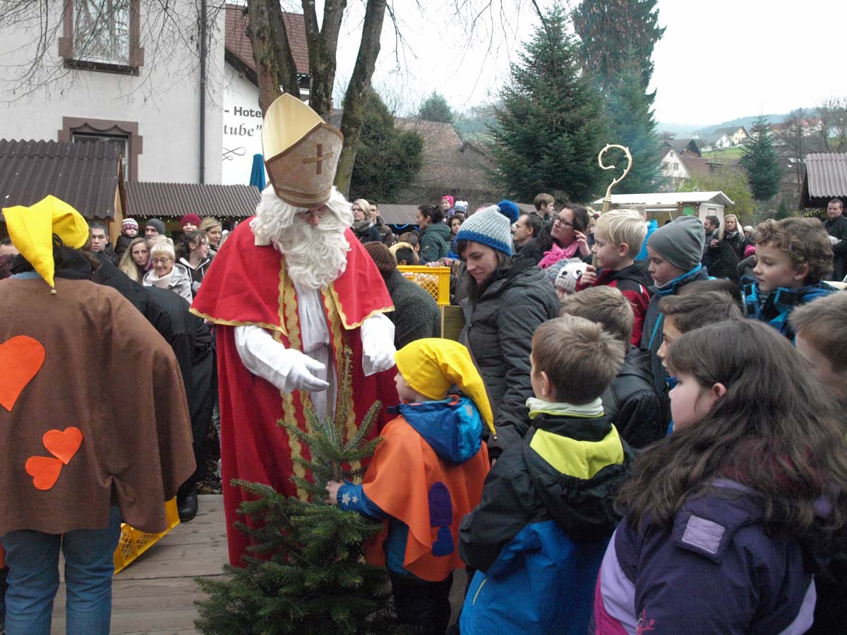 Michaela Neuberger stellte mit ihrer Schauspielertruppe die Geschichte »Der kleine Igel und das große Geschenk« dar und machte damit auf den Märchenweg an der Katzenhalde neugierig. Der Besuch von Nikolaus und Knecht Ruprecht war für die Kinder der Höhepunkt. Die Schulfüchse aus dem Kinderhaus »Sonnenblume« hatten sich als Weihnachtswichtel verkleidet und erfreuten den hohen Besuch mit einem Lied, Gedichten und einem Tanz. Dafür wurden sie, wie alle anderen anwesenden Kinder auch, mit einem Gebäck beschenkt.