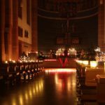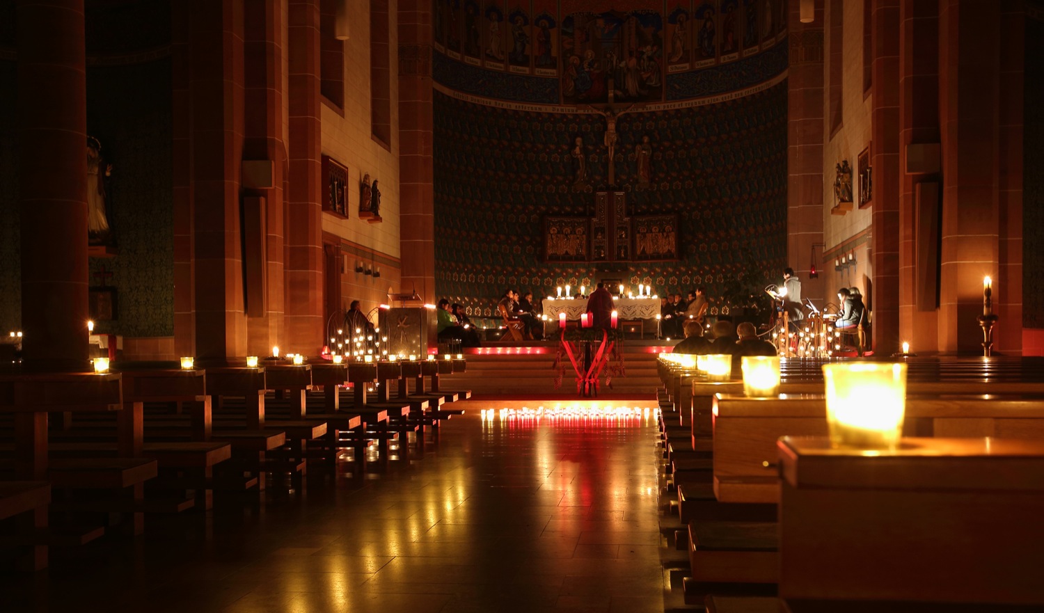Lautlos richten die Kerzen ihr flackerndes Licht nach dem Luftzug aus, wenn ein weiterer Gottesdienstbesucher die Tür öffnet. Der anmutige Kerzenschein stimmt die Gläubigen auf den Gottesdienst ein. Nur das eine oder andere LED-Lämpchen leuchtet kurz auf, um beim Lesen etwas zu helfen. Pfarrer Bonaventura Gerner zelebriert die Messe mit dem Rücken zum von Kerzen erleuchteten Kirchenschiff. Die Gläubigen haben sich in der Apsis rund um den Altar versammelt. Die begleitenden Texte des morgendlichen Gottesdienstes haben die »Sehnsucht nach Licht« als Thema.