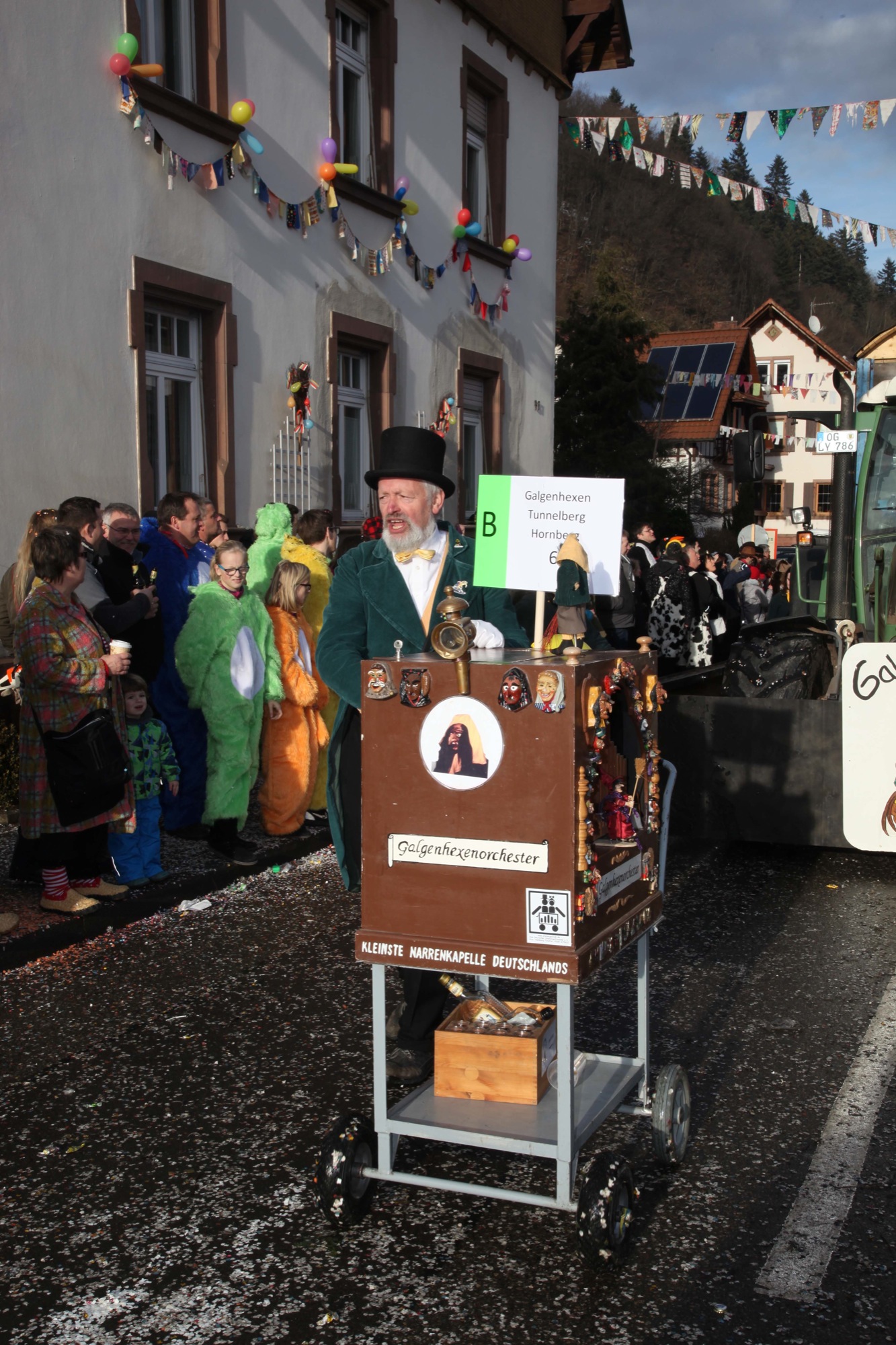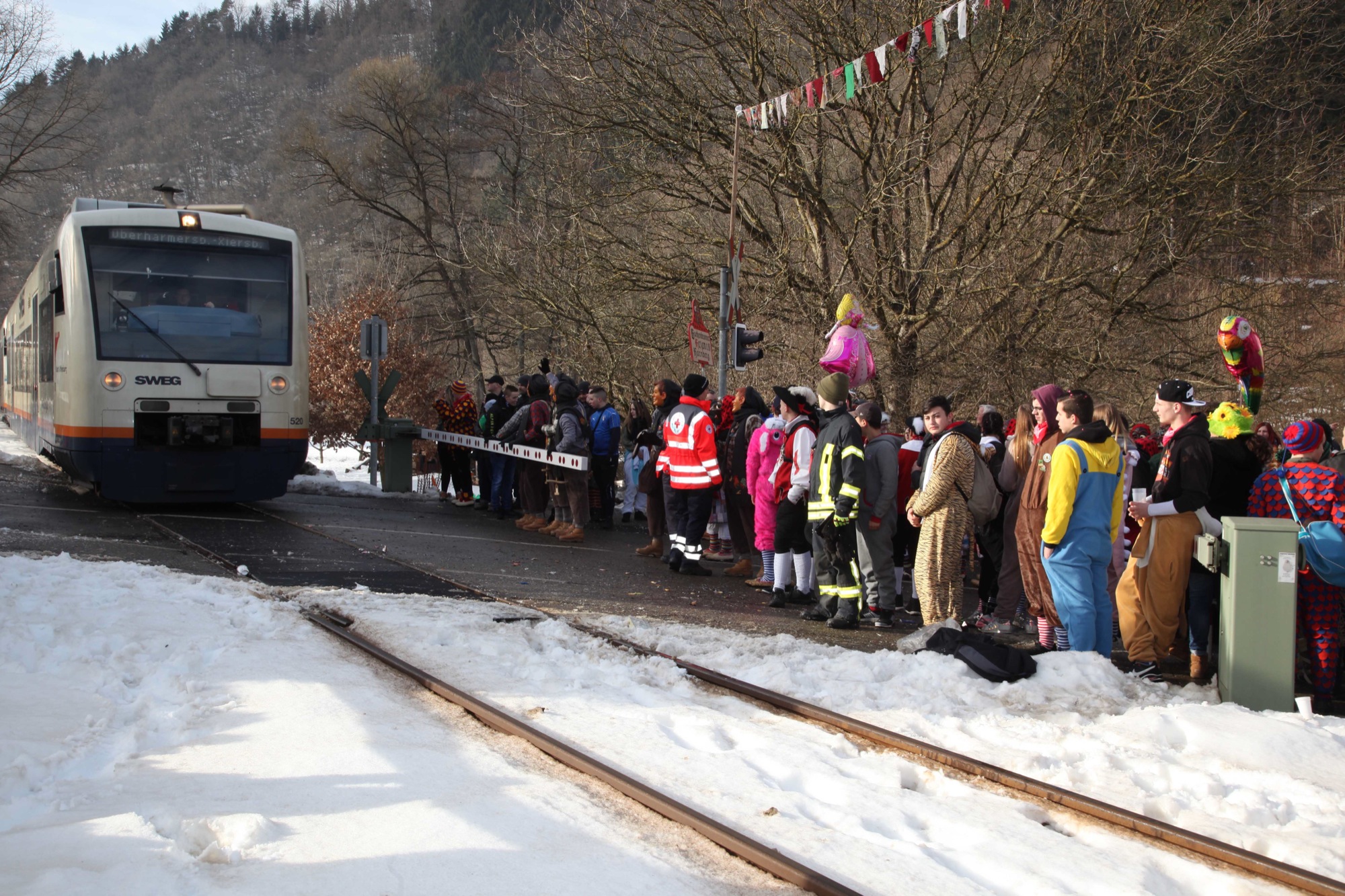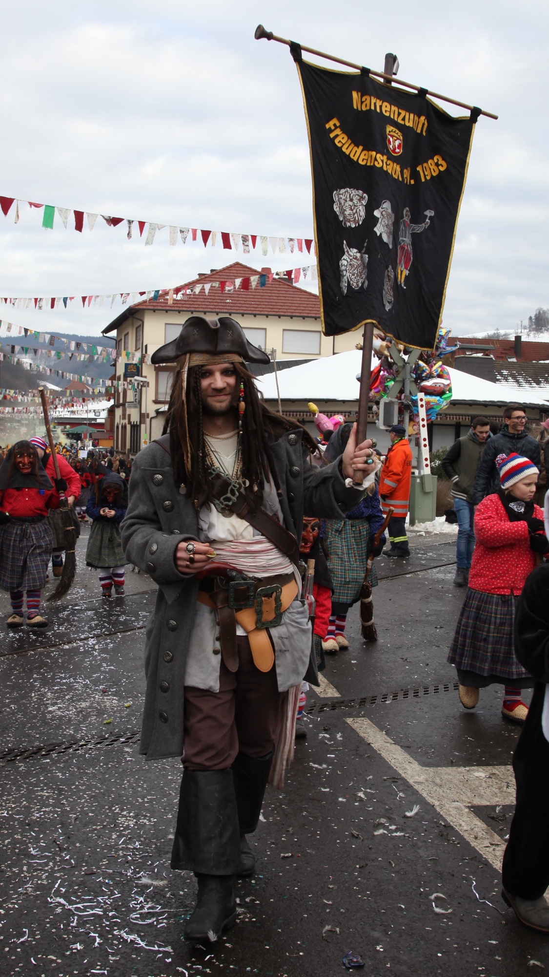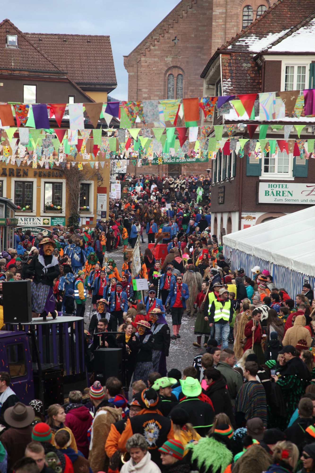 Es schien kein Ende nehmen zu wollen. Bahn und Busse spuckten immer wieder neue Gruppen aus, die sich zum Aufstellungsplatz bewegten. Für über drei Stunden verwandelten sie die Talstraße in ein buntes Farbenmeer. 93 Fasentgruppen aus dem Verband Oberrheinischer Narrenzünfte (VON) und benachbarte Gruppen boten an die 5.000 Hästräger auf, um zu gratulieren. Von Wehr bis in die nördliche Ortenau, von Breisach bis Alpirsbach fanden sich die Narren ein. Dabei waren auch aus der Nachbarstadt Zell a. H. sowie Alpirsbach und Rheinfelden, die den weitesten Anfahrtsweg hatten, mit jeweils 150 bis 200 Hästrägern die stärksten Zünfte.