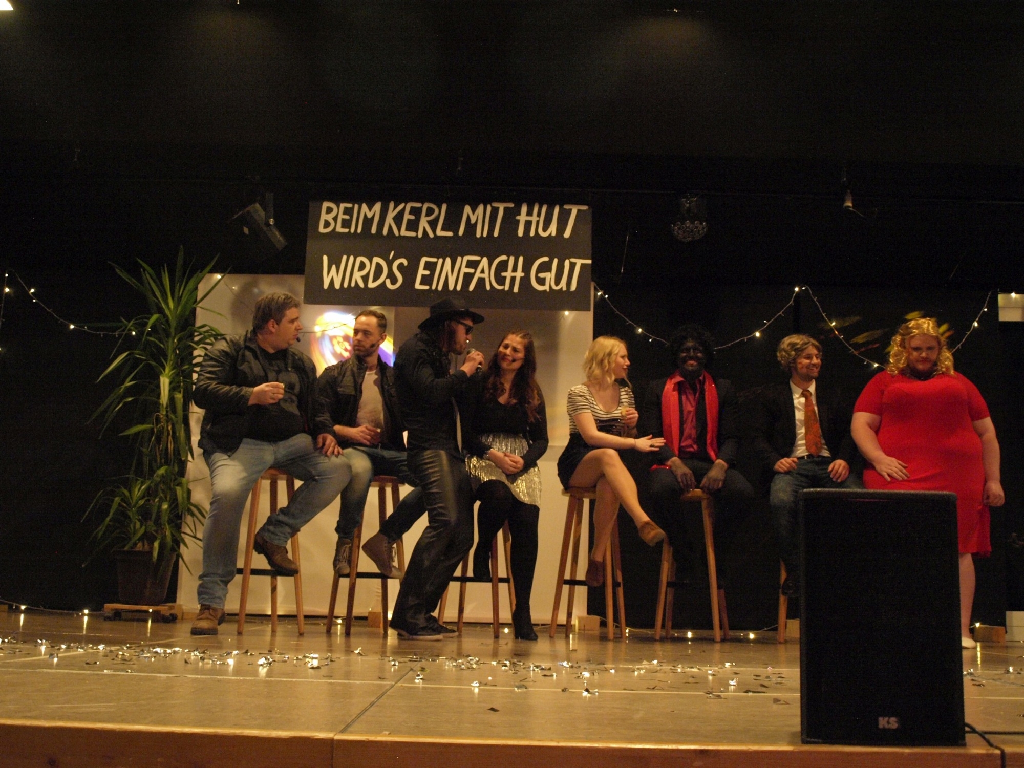 Auf Tour in den Zoo waren die Kiga-Kinder des Fanclubs und gingen, altklug oder treu-doof, ihren Betreuerinnen ziemlich auf den Wecker. Im Tiergehege konnten sie einige exotische SVO-Viecher bewundern. Doch das hätten sie auf dem Sportplatz auch gekonnt. Für´s Dorfbecke hatten die Narren zudem noch eine Geschäftsidee parat und ließen Chefin Rita am Dorfer Bahnhof mit Bauchladen aufmarschieren, die den Reisenden Brezeln verkaufte. »Beim Kerl mit Hut wird’s einfach gut« hieß es dann und für die Glanznummer des Abends versammelten sich zu einem Eierlikörchen bei Gastgeber Udo Lindenberg Stars und Sternchen aus der Schlagerwelt, angefangen von Andrea Berg und Robert Blanco bis hin zu Michelle, Helene Fischer und Florian Silbereisen.