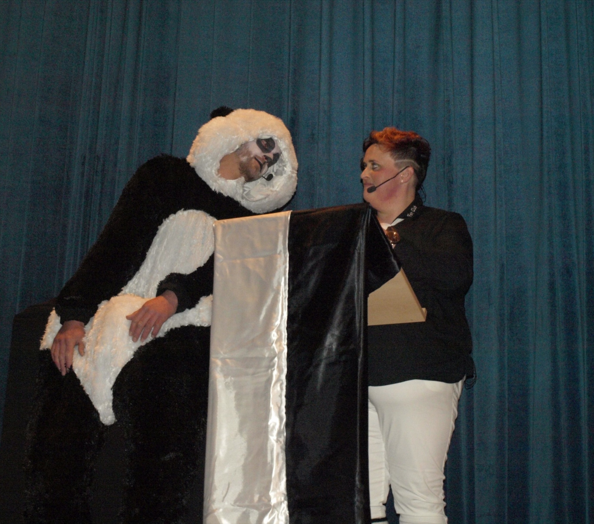 Schwarzweiß war schon beim Einmarsch Trumpf, bei dem die Akteure als Pandabären mit ihrem »Pfleger« Niklas Ernst zusammen mit dem Publikum ein gymnastisches Aufwärmprogramm absolvierten. Wird der Panda zum neuen Maskottchen des SVO? Auch Oberfan Karolina Kornmayer hatte einen in Gestalt von David Hug mitgebracht und stellte in der Bütt dem Publikum die »Top-Elf« der Liga in treffenden Versen und in Bildern vor, die es, so ihr Traum, bis in die Bundesliga schaffen wird. Und da geht es nicht ohne einen tierischen Glücksbringer. Weil es für den SVO derzeit perfekt läuft, gab es für den Oberfan überhaupt nichts zu meckern, dafür erfuhr das Publikum einige interessante Neuigkeiten über Trainer und Spieler, wozu der Panda in Liedform seinen Senf dazugab.