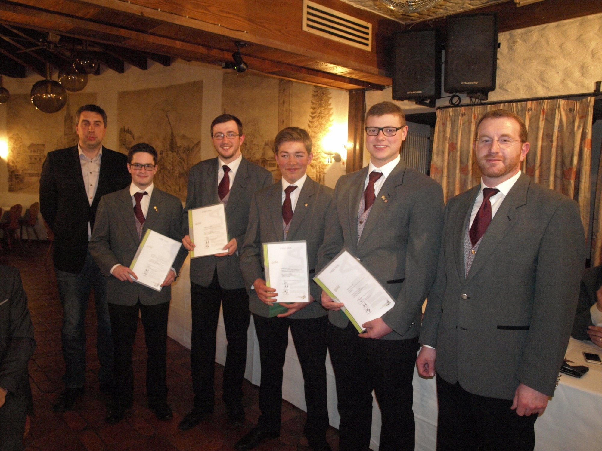 Vier Jungmusiker hatten im vergangenen Herbst die Prüfung zum goldenen Leistungszeichen abgelegt. Bezirksvorsitzender Jürgen Isenmann gratulierte dazu im Namen des Verbandes Philipp Armbruster, Daniel Faist, Thimo Lehmann und Philipp Maier und überreichte ihnen die Urkunden. Wegen Erkrankung konnte Carina Mark die Glückwünsche zur bestandenen C3-Dirigentenprüfung nicht entgegennehmen.