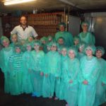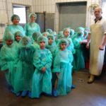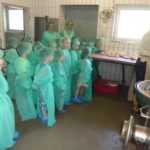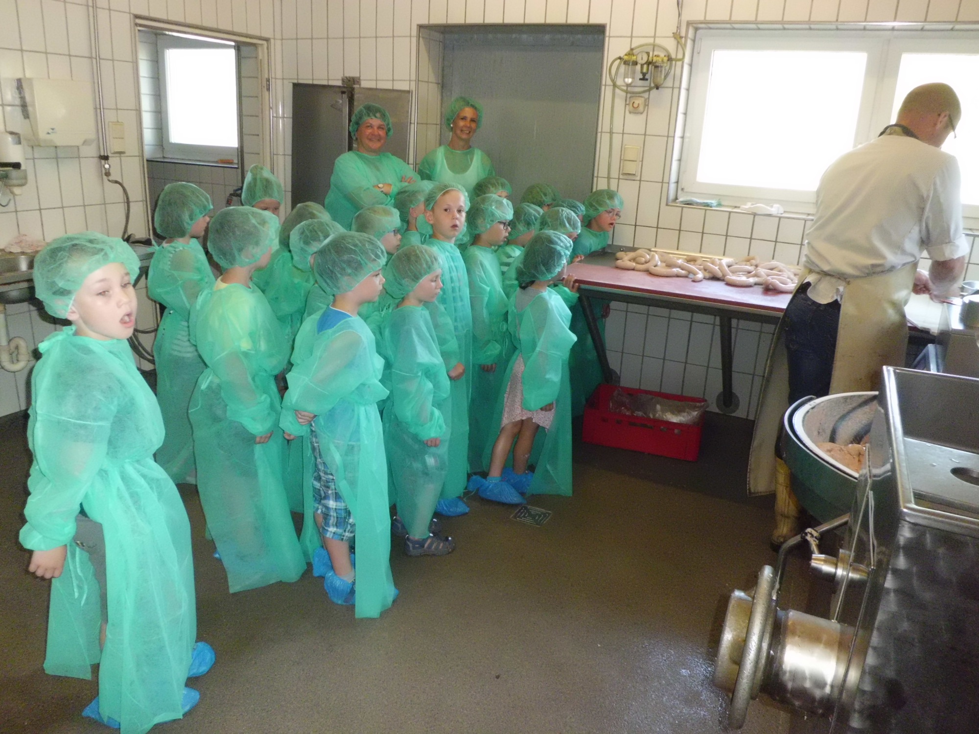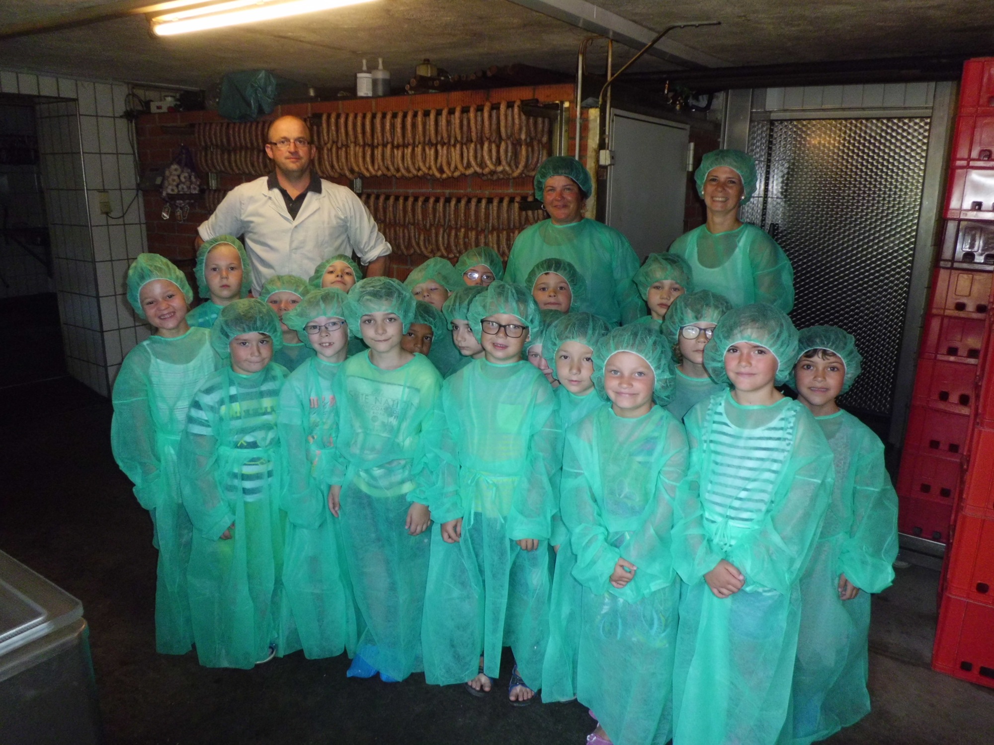 Los ging es mit dem Bus nach Oberharmersbach-Riersbach, dann zu Fuß zum Selbstvermarktungshof »Donissi«. Dort wurde die Gruppe schon von Markus Schwarz empfangen. Nachdem die Rinder in der Offenstallhaltung ausgiebig begutachtet, gestreichelt und gefüttert worden waren, mussten sich alle aus hygienischen Gründen Schutzkleidung überziehen. Dann zeigte der Gastgeber den Kindern, wie Rind- und Schweinefleisch in einem riesigen Fleischwolf zerkleinert wird. Mit den entsprechenden Gewürzen und Eis versehen, kam dann das Fleisch in den Cutter und wurde, während sich alle wegen der enormen Lautstärke die Ohren zuhielten, weiter bearbeitet bis ein sämiger, gleichmäßiger Fleischbrei, das sogenannte Brät, entstanden war. Das Brät wurde rasch in die nächste Maschine gefüllt und in einen etwa drei Meter langen Darm gepresst. Mit geübter Metzgerhand wurden die einzelnen Würste abgedreht und dann zum Trocknen und späteren Räuchern aufgehängt.