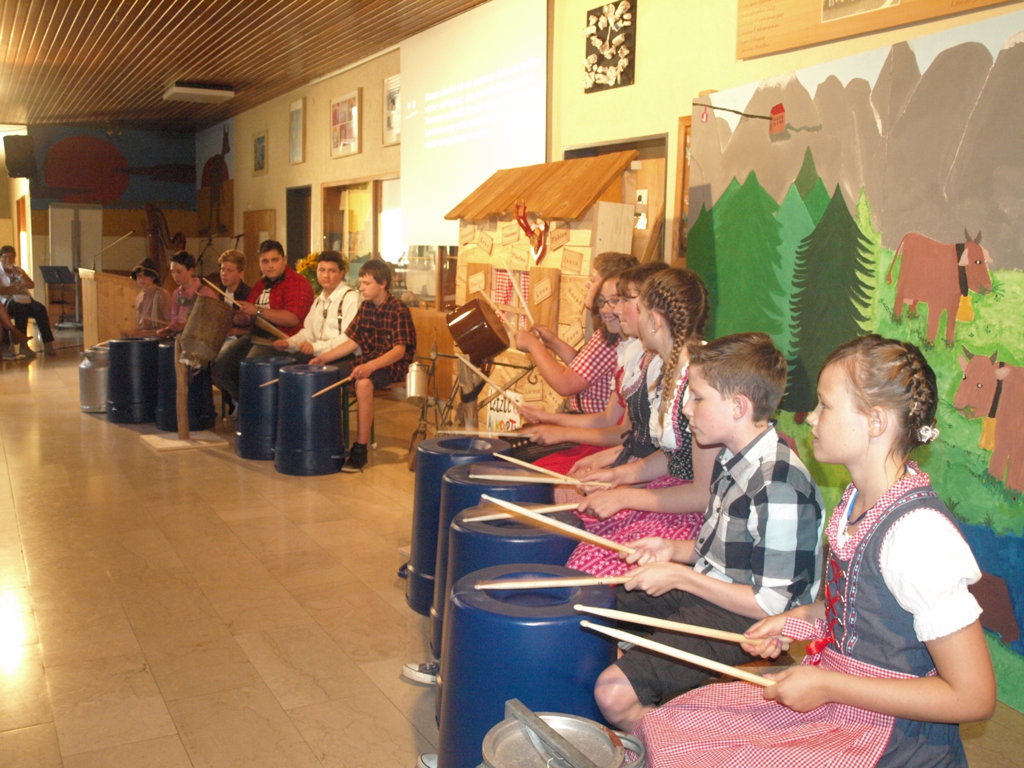Das abwechslungsreiche Programm der Feierstunde eröffneten Annemarie und Magdalena Laifer auf ihren Harfen. Die 7.- und 8.-Klässler veranstalteten im entsprechenden Outfit eine Alm-Party und hauten im wahrsten Sinn des Wortes gekonnt auf die Pauke. Der Lehrerchor beteuerte in seinem Liedbeitrag überzeugend, dass Lehrer »keine Schweine« sind und die Abschlussklasse präsentierte neben einem Lied eine Bildershow von ihrer Fahrt nach Rimini sowie zwei lustige Ratespiele.