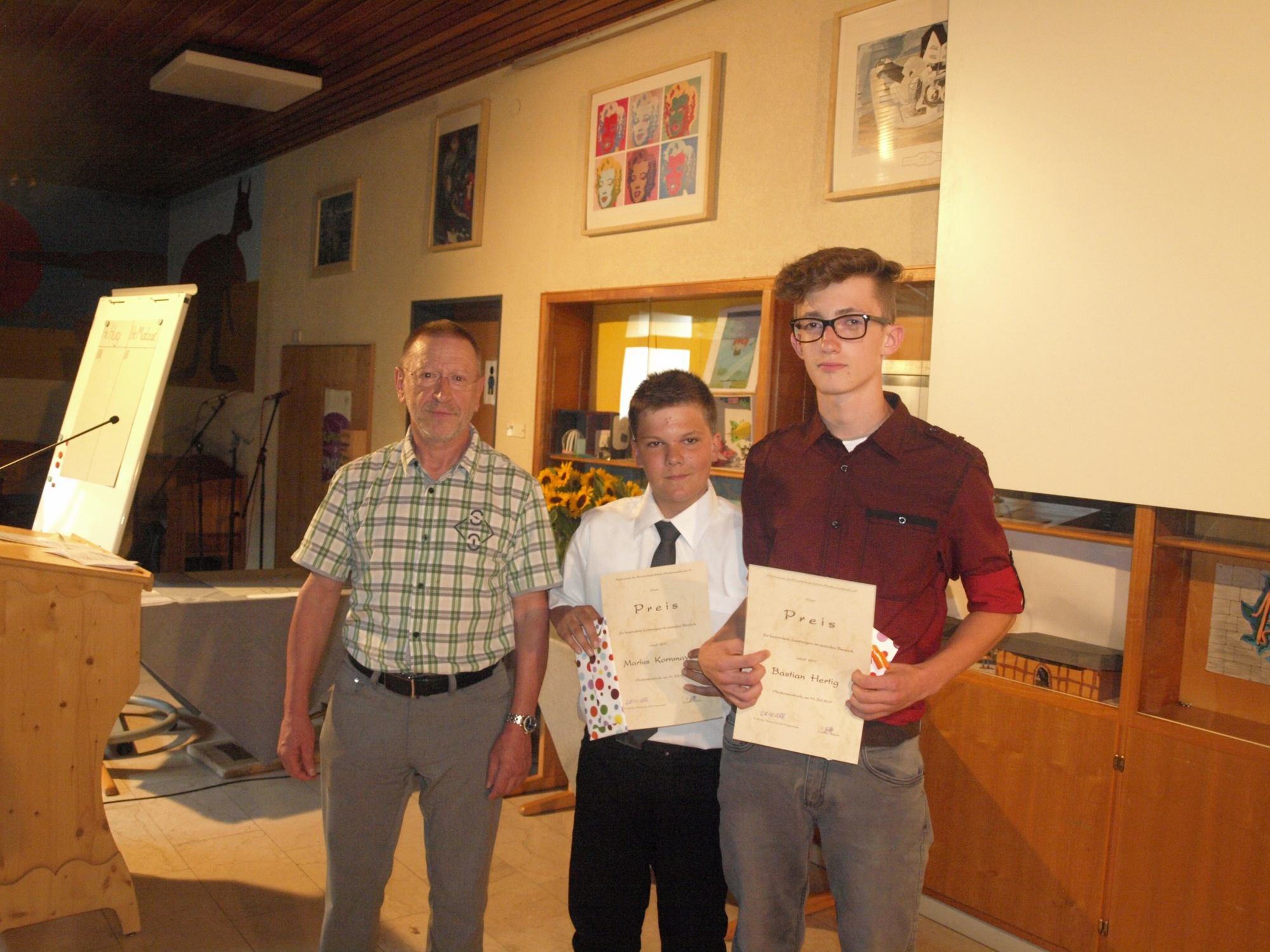 Für ihre hervorragende Leistung wurden Fabian Kranz (Notenschnitt 1,6) und Florian Lehmann (1,8) mit Preisen ausgezeichnet. Für ihr außergewöhnliches soziales Engagement erhielten Bastian Hertig und Marius Kornmayer den vom Förderverein gestifteten Preis, den ihnen Vorsitzender Berthold Bürkle überreichte.