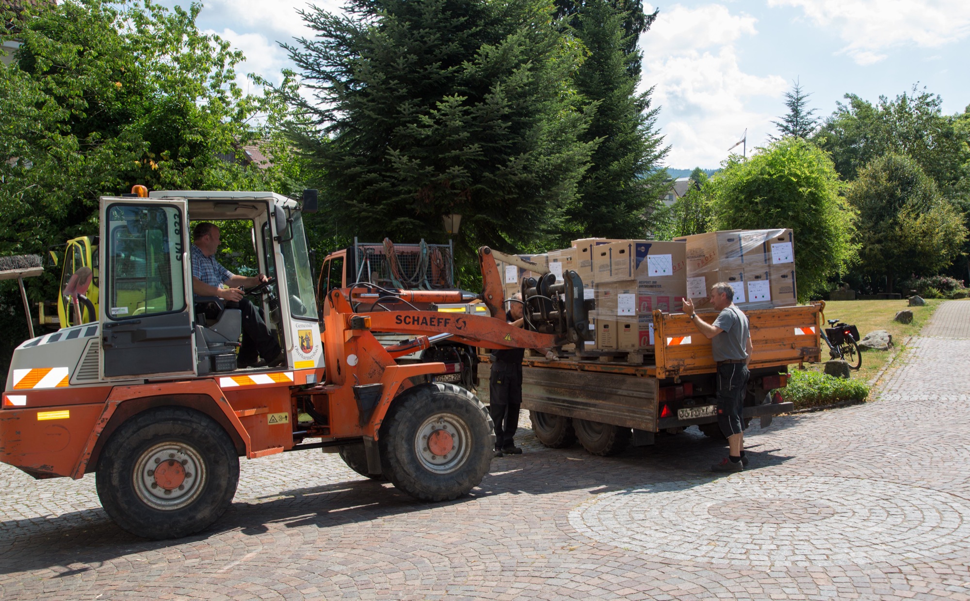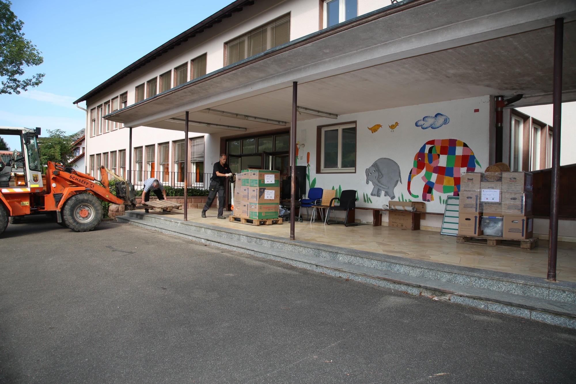 Während Mitarbeiter des Bauhofs palettenweise die benötigten Bestände verladen, Schränke demontieren und Schreibtische aus dem Rathaus tragen, macht sich das Rathauspersonal daran, die Räume der ehemaligen Schule Riersbach für die gewohnte Verwaltungsarbeit herzurichten, denn dort wird voraussichtlich bis in die zweite Hälfte des Jahres 2019 das Rathaus mit seinen Ämtern vorübergehend untergebracht sein. Gemeinderatssitzungen werden hier ebenso abgehalten wie die Trauungen des Standesamtes.