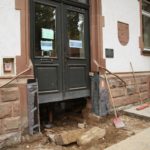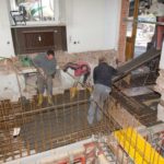 Die vier Stufen vor dem Haupteingang sind zwischenzeitlich verschwunden, die Tür sieht aus, als wäre dem Schreiner das Maß »kalt« geworden. Rechter Hand fehlt der Boden im bisherigen Vorzimmer des Bürgermeisters, der Blick reicht bis in den Keller. Wegen der Verlegung einiger Treppenstufen zur ersten Ebene sind die Eisenträger sichtbar, deren Zwischenraum leicht gewölbt mit Backsteinen ausgemauert ist. Hier wachsen gerade die Wände des Fahrstuhlschachtes empor. Über zehn Kubikmeter Beton wurden hier schon eingebaut.