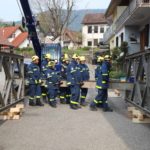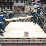 Jetzt werden die restlichen Querträger montiert und die Längsträger aufgebracht. 10 Zentimeter starke Sonderholzbohlen, deren seitliche Einkerbungen eine entsprechende Lage garantieren, bilden die Abschlussarbeiten. Gegen 16.30 Uhr, noch vor dem anvisierten Zeitpunkt der Fertigstellung, lud Zugführer Marc Wiencke seine Leute zum traditionellen »Brückenschnaps« ein.