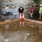 Dann begann der Wettlauf um die Plätze, den entlang der Strecke mehrere hundert Zuschauer interessiert verfolgten und vielleicht sogar mit der einen oder anderen »Lieblingsente« mitfieberten. Bei geringer Wasserführung zog sich das Teilnehmerfeld sehr bald weit auseinander. Einzelne Ausreißer schienen sich schon einen uneinholbaren Vorsprung verschafft zu haben. Doch dann wurden die einen von kleinen Strömungswalzen eingefangen und durcheinander gewirbelt, die anderen blieben im Dickicht am Ufer hängen, während wiederum anderen der ganze Trubel nicht besonders interessant erschien und die geringe Strömung hinter einem Stein noch schnell für ein kleines Schwätzchen in Freiheit nutzten, bevor die Enten wieder für ein Jahr in einer dunklen Kiste eingesperrt werden.