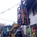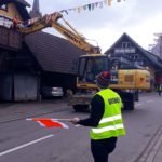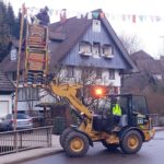 Der Zunftrat bedankt sich hier besonders bei Manfred Schöpf von der Firma Tiefbau Schöpf, der einen Bagger und einen Radlader zur Verfügung stellte und hier auch selbst aktiv war: er und Martin Kienzle steuerten die Fahrzeuge und somit die Hästräger samt Fähnchen sicher von Mast zu Mast.
