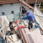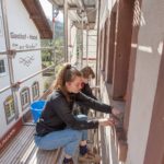Kleinere Teile, wie die exakt nachmodellierten Nonnenköpfe, werden meist mit Muskelkraft passgenau in die vorbereitet Lücke eingesetzt. Rund 11 laufende Meter sind an der West- und Ostseite (7,5 bzw. 3,5 Meter) schon erneuert. Bei größeren Teilen, wie den Fensterbänken muss ein Flaschenzug helfen. Jedes dieser Teile 23 Teile wiegt bis zu 350 Kilogramm. Etwa zehn laufende Meter Sockel- und Gurtgesims waren an den drei Seiten zu ersetzen. Ein Kran hievte die rund 300 Kilogramm schweren neuen Abdeckplatten auf der Südfassade an ihren angestammten Platz.
