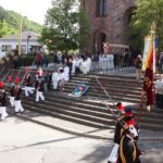 Nicht nur die Oberharmersbacher werden an diesem Tag das farbenprächtige Zeremoniell vermissen. In Bussen kamen jeweils die Besucher aus der Umgebung und dem angrenzenden Elsass, um den Aufmarsch der über 130 Uniformträger vor dem Rathaus zur Fahnenparade zu verfolgen. Nicht minder beeindruckend war der Einzug in das riesige Gotteshaus. Die Prozession zur Brandenkopfschule, bei der auch Trachtenfrauen zu sehen waren, entfällt ebenso wie das Zeremoniell am Nachmittag, bei dem mit klingendem Spiel und einem dreifachen Salut der Geistlichkeit die Reverenz erwiesen wird.