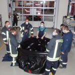 Also Neuplanung: Die monatliche Probe wurde auf zwei Abende verteilt, die jeweils anwesenden Feuerwehrkameraden wurden in zwei Gruppen getrennt, alle mit Mundschutz ausgestattet. Die eine Gruppe erhielt grundsätzliche Einweisung in das Verhalten im Alarmfall. Das Aufsuchen des rückwärtigen Eingangs, um den Ablauf nicht zu stören, dann den Weg einschlagen zu den Umkleidekabinen, wo künftig jedes aktive Wehrmitglied, getrennt nach Geschlechtern und Jugendwehr, seinen Spind mit der Einsatzkleidung und sein Wertfach hat sowie die Nasszellen angegliedert sind. Dietmar Lehmann verweist bei dem Rundgang auf den Bildschirm neben der Tür zur Fahrzeughalle. Hier wird im Alarmfall der Einsatzort mit Wegeskizze und Koordinaten angezeigt.