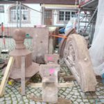 Seit der Demontage der rund 40 teilweise stark verwitterten Sandsteine Ende September des vergangenen Jahres waren Marcel Ohnesorge und seine Mitarbeiter aber keineswegs untätig. In einem eigens für die Oberharmersbacher Baustelle errichteten Zelt auf dem Gelände der Oberkircher Firma – anders war die Materialmenge nicht zu bewältigen – werden die Sandsteinblöcke exakt kopiert.