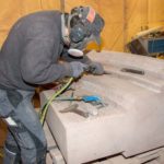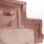 Anhand der Vorlagen werden die Steine auf Maß gesägt, dann beginnt die eigentliche Arbeit zur Bearbeitung vor allem der sichtbaren Oberflächen, die im Original teilweise auch Verzierungen und Ornamente tragen. Steinmetz- und Steinbildhauermeister Gerhard Rettinger arbeitet an einem großen Sandsteinblock mit einem Gewicht von mehreren hundert Kilogramm. Deutlich sind schon Rundungen und endgültige Konturen zu erkennen, die er jetzt Millimeter für Millimeter in Feinarbeit nachzieht. Druckluft entfernt immer wieder den Staub, bevor er den Meißel erneut exakt ansetzt. Die Flächen weisen bereits die Handscharrierung auf.