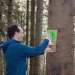 Der ehemalige Gemeindeförster kennt aufgrund seiner Erfahrung genau die Bäume, an denen Nistkästen hängen. Um anderen das Aufspüren zu erleichtern, weist künftig ein grüner Punkt am Stamm auf eine Nistmöglichkeit hin. Bürgermeister Richard Weith setzt an diesem Morgen die Markierungen entlang des »Durchgängigen Weges«.