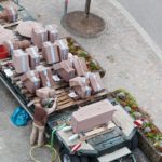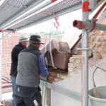 Es galt, die frostfreien Tage – und Nächte – abzuwarten, ehe die Arbeiten wieder anliefen. Der auffällig kalte April bremste den Fortgang der Sanierung. Am Dienstagmorgen lieferte ein Tieflader den Großteil der Fassadensteine für den Giebel. Für die Schlussarbeiten zeichnet die Mannschaft verantwortlich, die im September des vergangenen Jahres auch die Abdeckplatten abgenommen hatte. Wer abbaut, muss auch wieder aufbauen, könnte die Devise lauten.