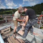 Vier Tage zuvor wäre man allein mit Muskelkraft nicht weit gekommen. Neben anderen Teilen der geschwungenen Fassade fand auch der Abschlussstein seinen angestammten Platz. Martin Schmieder von der Oberharmersbacher Firma Schnurr nahm den 1,1 Tonnen schweren Klotz an den Haken. Mit einem Flaschenzug wurde der Schluss-Stein Millimeter für Millimeter abgesenkt und exakt positioniert.