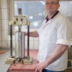 Abgefüllt wird die Wurst mithilfe einer Wurstspritze. Die erste seines Lebens schenkte Schwarz dereinst die Oma, da war er im zweiten Lehrjahr. Zwar nutzt er diese Spritze nicht mehr, hält sie jedoch hoch in Ehren: Ein Sechs-Kilo-Gerät, dessen Kurbel von Hand gedreht werden musste, um beispielsweise Bratwurst in Schweinedärme zu füllen. Im laufenden Betrieb ist es längst einer elektronisch gesteuerten 30-Liter-Maschine mit Hydraulik gewichen.