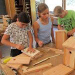 Die Kinder im Alter von 9 bis 13 Jahren machten sich nun an die Arbeit, die vorgefertigten Holzteile zu einem fertigen Nistkasten zusammenzubauen. Dazu mussten zunächst Löcher für die Schrauben und vor allem das Einflugloch gebohrt werden. Mit Akkuschrauber wurden die Teile miteinander verschraubt und eine Möglichkeit zum Aufhängen des Kastens angebracht. Die Jungen und Mädchen waren so eifrig bei der Sache, dass einige es schafften, in den zwei Stunden sogar zwei Nistkästen anzufertigen.
