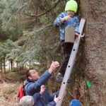 Mit der Leiter als unverzichtbares Hilfsmittel ging es nun auf die ca. 3 Kilometer lange Strecke. Die Kinder durften die Leiter tragen, sie an die Bäume mit den Nistkästen anstellen, auf die Leiter steigen, und die Nistkästen abhängen. Erwachsene sicherten dabei die Leiter. War der Kasten am Boden, war die Spannung groß, ob überhaupt und wer wohl in dem Nistkasten gewohnt hat. Hobbyornithologe Joachim Nock erklärte den Kindern anhand des Nest-aufbaus, welcher Vogel darin gebrütet hat. Nahezu alle Kästen waren belegt, einige wenige wurden auch nur als Schlafplatz benutzt, was anhand des Nestes zu erkennen war.