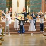 In der mit bunten Blumen, Bändern und Luftballons dekorierten Kirche wurde sodann der Festgottesdienst durch Pfarrer Gerner eröffnet. Olivia Isenmann begrüßte alle Gäste und freute sich sehr darüber, verkünden zu dürfen, dass die Kommunionkinder den Gottesdienst durch die Auswahl der Lieder, das Verfassen von Gebeten und das Verschönern des Altars mit einem bunten Bild eines Regenbogens mitgestaltet hatten.