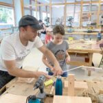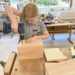 Die Kinder im Alter von 9 bis 13 Jahren machten sich an die Arbeit, unterstützt von Tobias Haaser, die vorgefertigten Holzteile zu einem fertigen Nistkasten zusammenzubauen. Dazu mussten zunächst Löcher für die Schrauben und vor allem das Einflugloch gebohrt werden. Mit Schrauben wurden die Teile miteinander verbunden und eine Möglichkeit zum Aufhängen des Kastens angebracht.