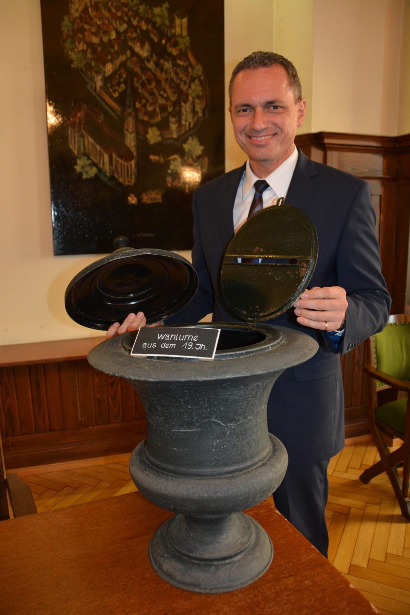 Dass der Gang zur Wahlurne eine lange Tradition hat beweist ein Fundstück, das Bürgermeister Günter Pfundstein im Storchenturm-Museum entdeckt hat. Es ist eine als Blech geschmiedete Wahlurne aus dem 19. Jahrhundert. Beim Rundgang mit den »Zelli«-Kindern im Sommer habe er ganz oben unterm Dach des Museums das seltene Stück gefunden. Die Wahlurne wird am Wahlsonntag im Rathaussaal ausgestellt. Vielleicht animiert sie noch den einen oder anderen zur Stimmabgabe, hofft Bürgermeister Pfundstein.