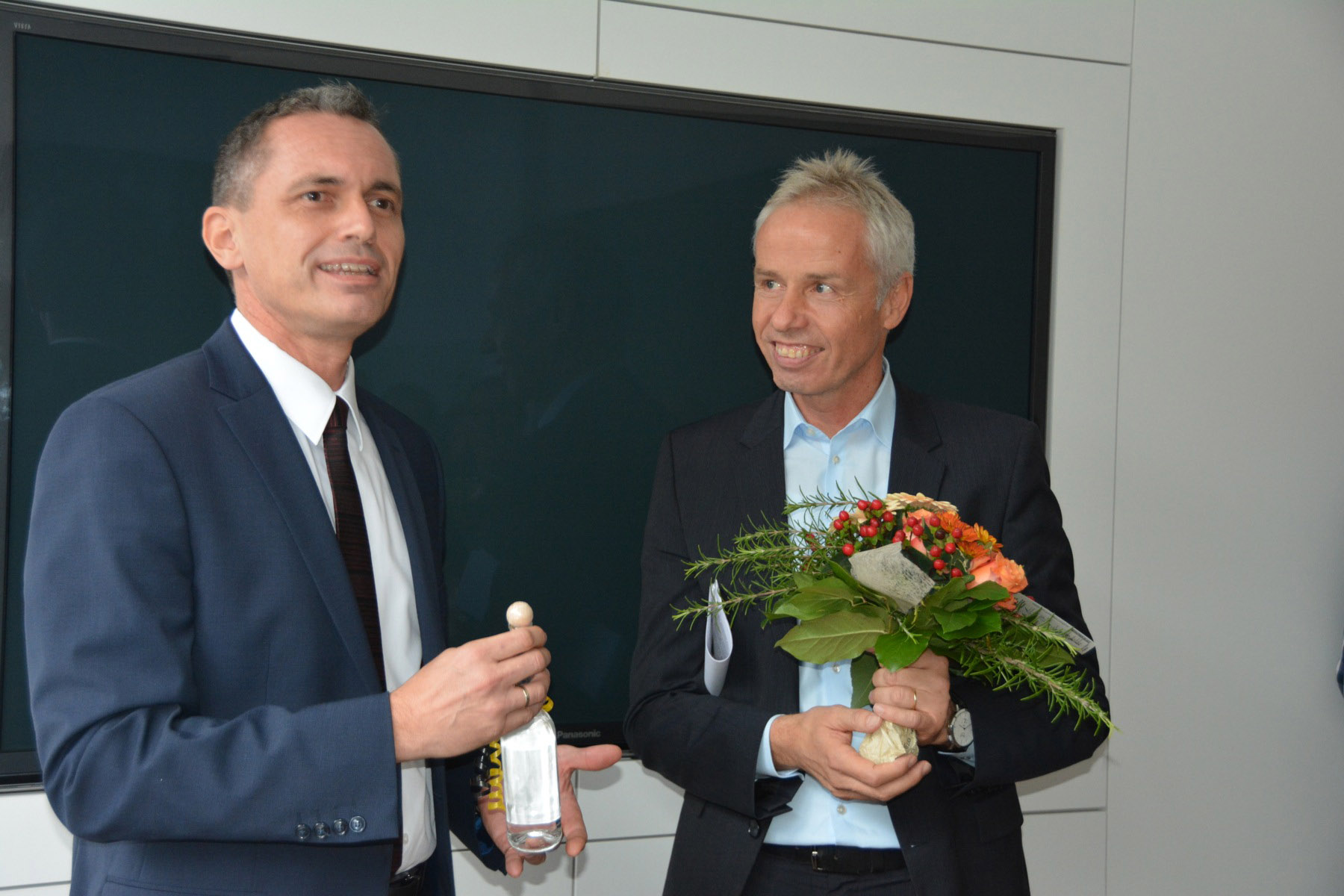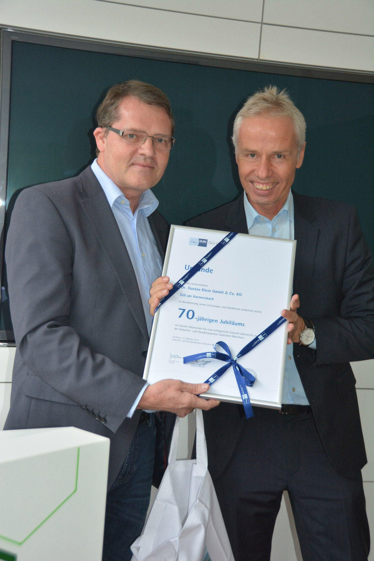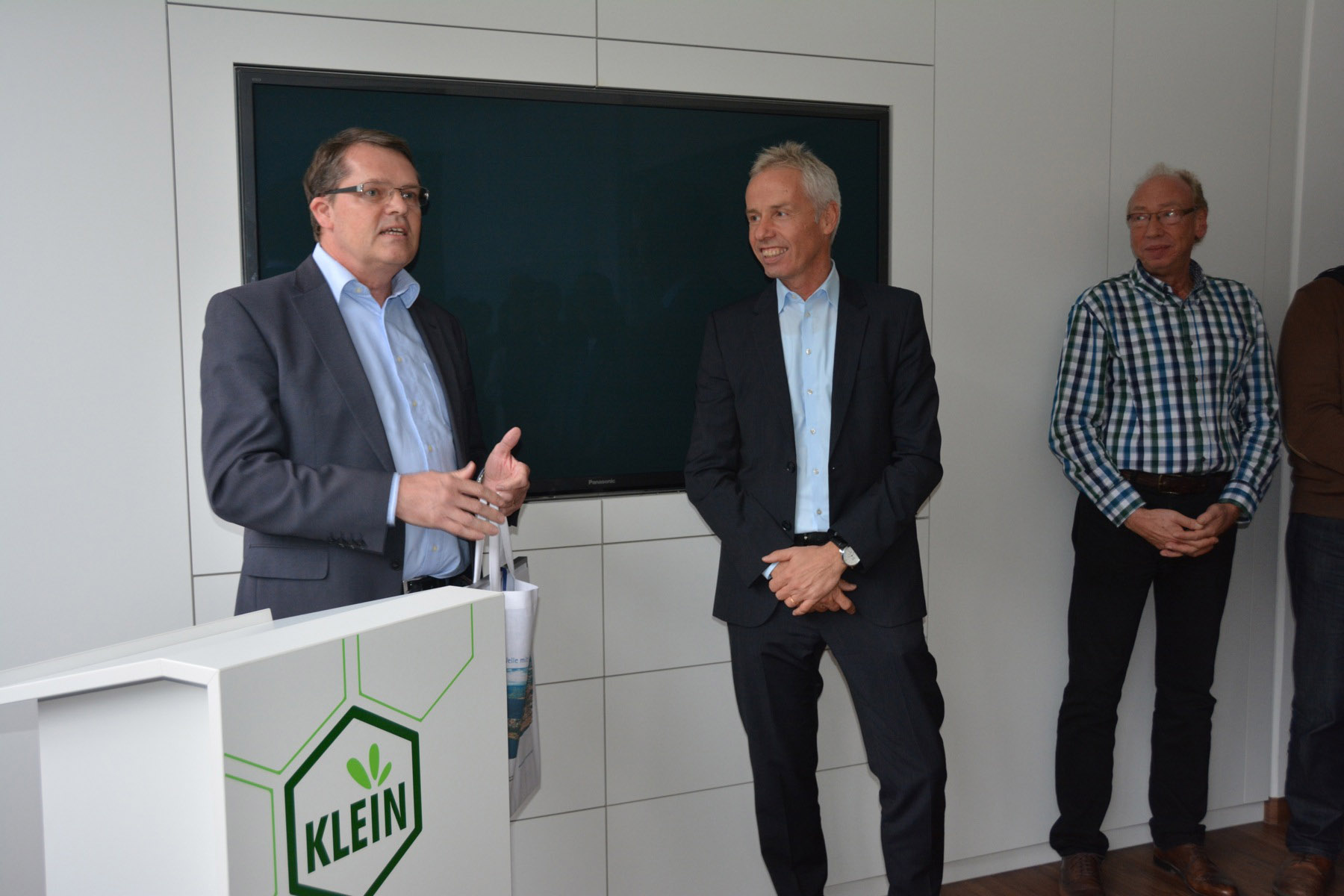 »Die Firma Klein ist ein besonderes Unternehmen«, lobte Michael Bertram, der Leiter des Geschäftsgebiets Gründung und Förderung der IHK Südlicher Oberrhein. Er überreichte Geschäftsführer Muhle die Dankesurkunde der IHK zum 70-jährigen Firmenjubiläum und richtete die Grüße von IHK-Präsident Steffen Auer aus. Die Firma Klein stehe für Arbeitsplätze, Wertschöpfung und innovative Produkte. Dem Unternehmen wünschte der IHK-Repräsentant eine erfolgreiche Zukunft.