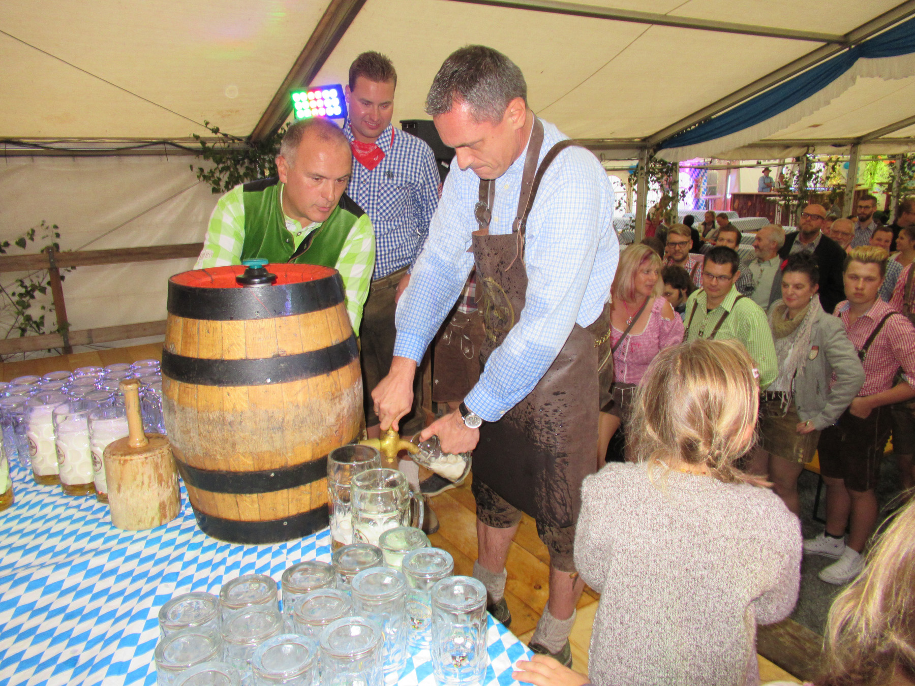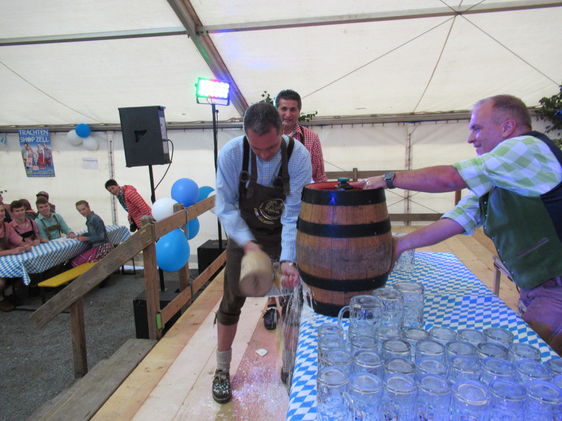 Bürgermeister Günter Pfundstein zapfte mit vier kräftigen Schlägen das erste Fass Oktoberfest-Bier an. Dabei wurde er von Wiesn-Wirt Mathias Damm unterstützt.